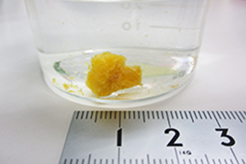 写真のようにかぼちゃの中で発見される白色や黄色がかった硬いものは、かぼちゃの成分である糖質やデンプン質が結晶化したもので、「クリスタル症状」と呼ばれます。