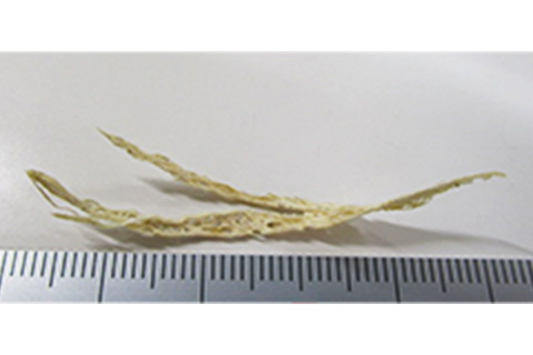 切干大根に、まれに写真の様な硬く噛み切れない木片のようなものが見つかることがあります。 この写真のものは、原料である大根の生育がやや進みすぎ、中心(芯)の部分の繊維が固くなる「塔立ち・木化」といわれる状態になったものです。 「塔立ち・木化」のものは硬く、風味もよくないため、お召し上がりはお控えください。