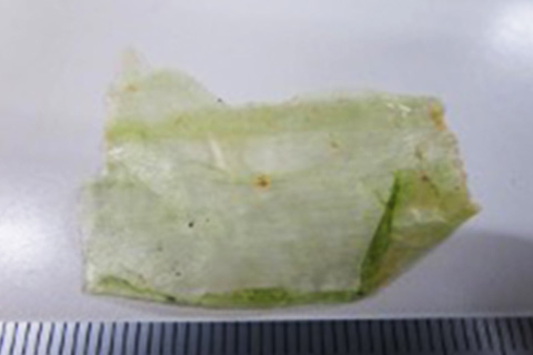 特に小松菜の茎の表皮は、剥がれますと透明なビニールと大変よく似ているため、ご心配でしたらお預かりしてお調べさせていただきますのでお申し出ください。