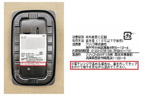 フタをつけたまま、シールをはがして、空気穴を開き、記載のワット数と時間を参考にしながら電子レンジで温めてお召し上がりください。